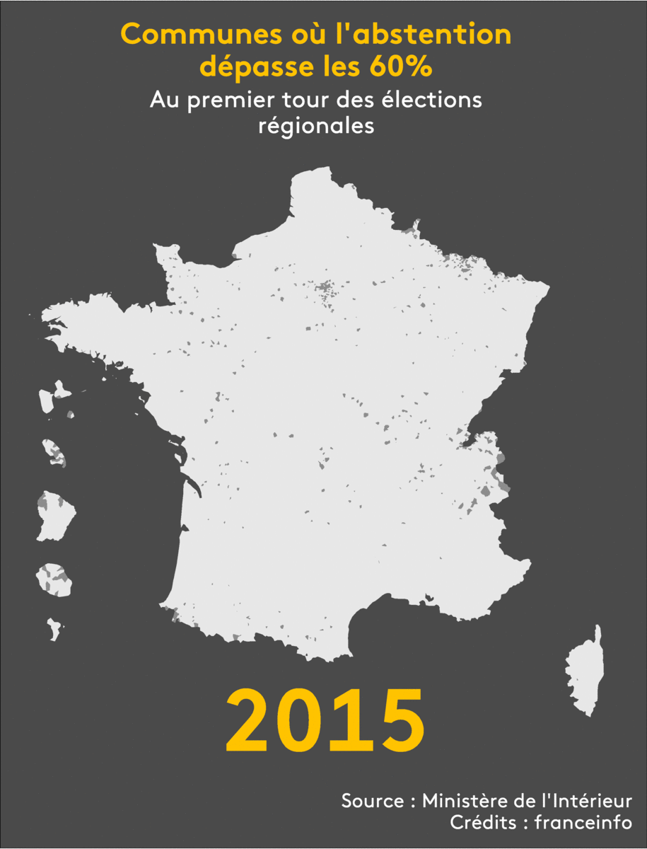 Ce record national se traduit également au niveau des communes : le nombre de villes où l'abstention a dépassé le seuil vertigineux de 60% a explosé. Alors qu'on en comptait 565 en 2015, on en dénombre plus de 18 100 en 2021, selon nos premiers calculs. Soit... 32 fois plus. Une augmentation particulièrement visible dans ce gif comparant les deux scrutins.