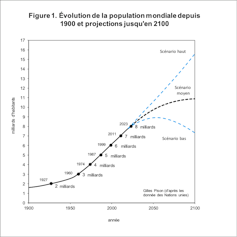 La prolongation des projections conduit à 10,9 milliards d’habitants en 2100 dans le scénario moyen et respectivement 16 et 7 milliards dans les scénarios haut et bas, comme l’illustre la figure 1 ci-contre.